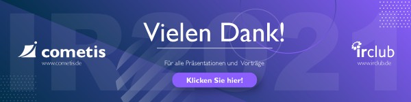 Mit rund 530 Investor-Relations-Professionals erfuhr die Konferenz in diesem Jahr nicht nur eine grandiose Resonanz, sondern auch deutlich mehr Anmeldungen als bei vergangenen Veranstaltungen der IR-Community. Auch inhaltlich konnten unsere Referentinnen und Referenten überzeugen: Mit einer Durchschnittsbewertung von 1,6 erhielten die Vorträge der IR auch in diesem Jahr wieder einmal Top-Bewertungen. Für die beeindruckende Beteiligung, das überwältigende Feedback und jeden noch so kleinen virtuellen Austausch bedanken wir uns ganz herzlich bei jeder und jedem Einzelnen von Ihnen!