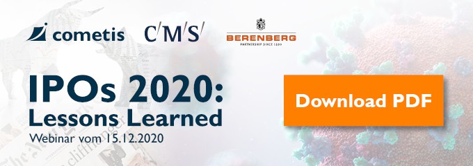 Das Jahr 2020 war bislang wahrhaft außergewöhnlich. Es stand für uns alle vor allem unter dem Eindruck der Corona-Pandemie. Auch Börsengänge in Deutschland waren davon betroffen – sowohl was Anzahl und Volumen betrifft, aber auch und insbesondere organisatorisch wurden die Akteure vor besondere Herausforderungen gestellt. cometis, Berenberg und CMS luden für den 15. Dezember 2020 zum Webinar, in dem wir über unsere Erfahrungen aus dem Corona-IPO-Jahr berichteten. Unter dem Motto „Lessons Learned“ haben wir unsere Erlebnisse, Beobachtungen und Erkenntnisse mit Ihnen geteilt und diskutiert.